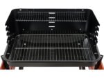 Gril à charbon de bois classique avec grille chromée et réglage en hauteur 4 positions au-dessus du foyer. Équipé de tablettes latérales rabattables, d’une plaque inférieure, d’une grille à charbon et d’un pare-vent.